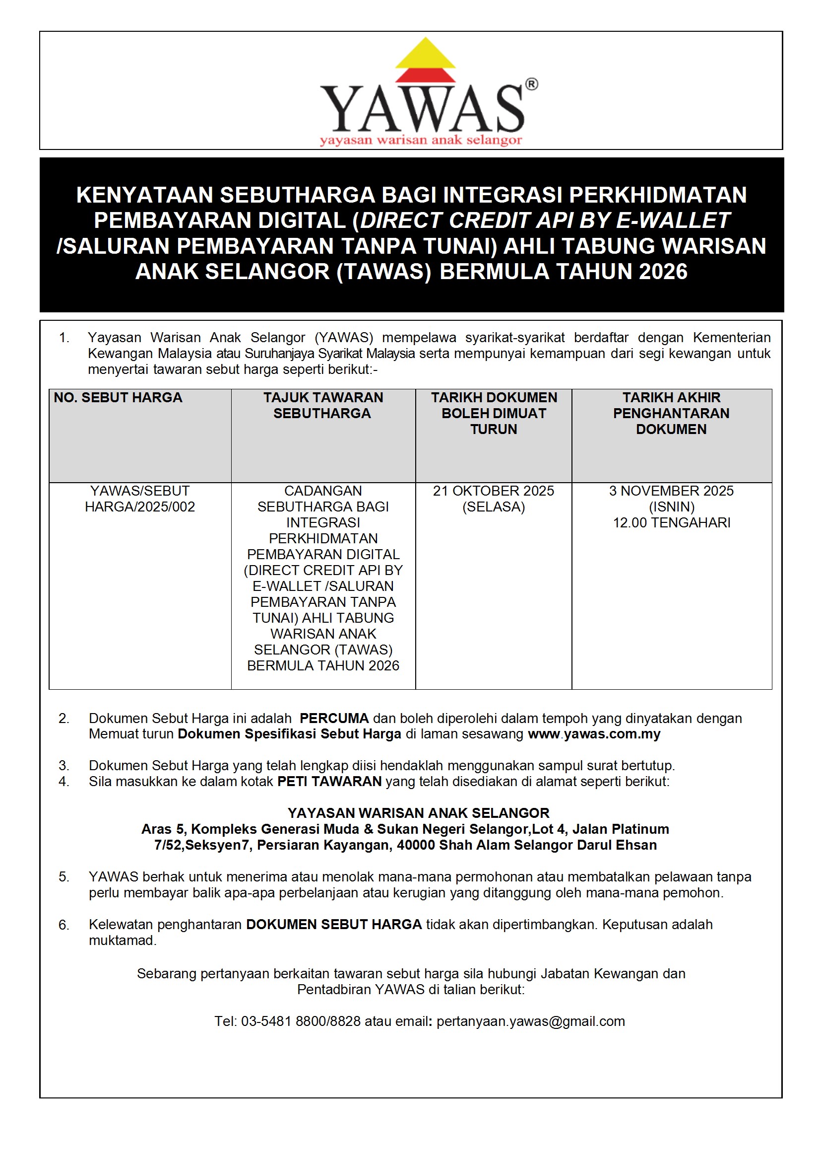 Yayasan Warisan Anak Selangor (YAWAS) mempelawa syarikat-syarikat berdaftar dengan Kementerian Kewangan Malaysia atau Suruhanjaya Syarikat Malaysia serta mempunyai kemampuan dari segi kewangan untuk menyertai tawaran sebut harga seperti berikut:-